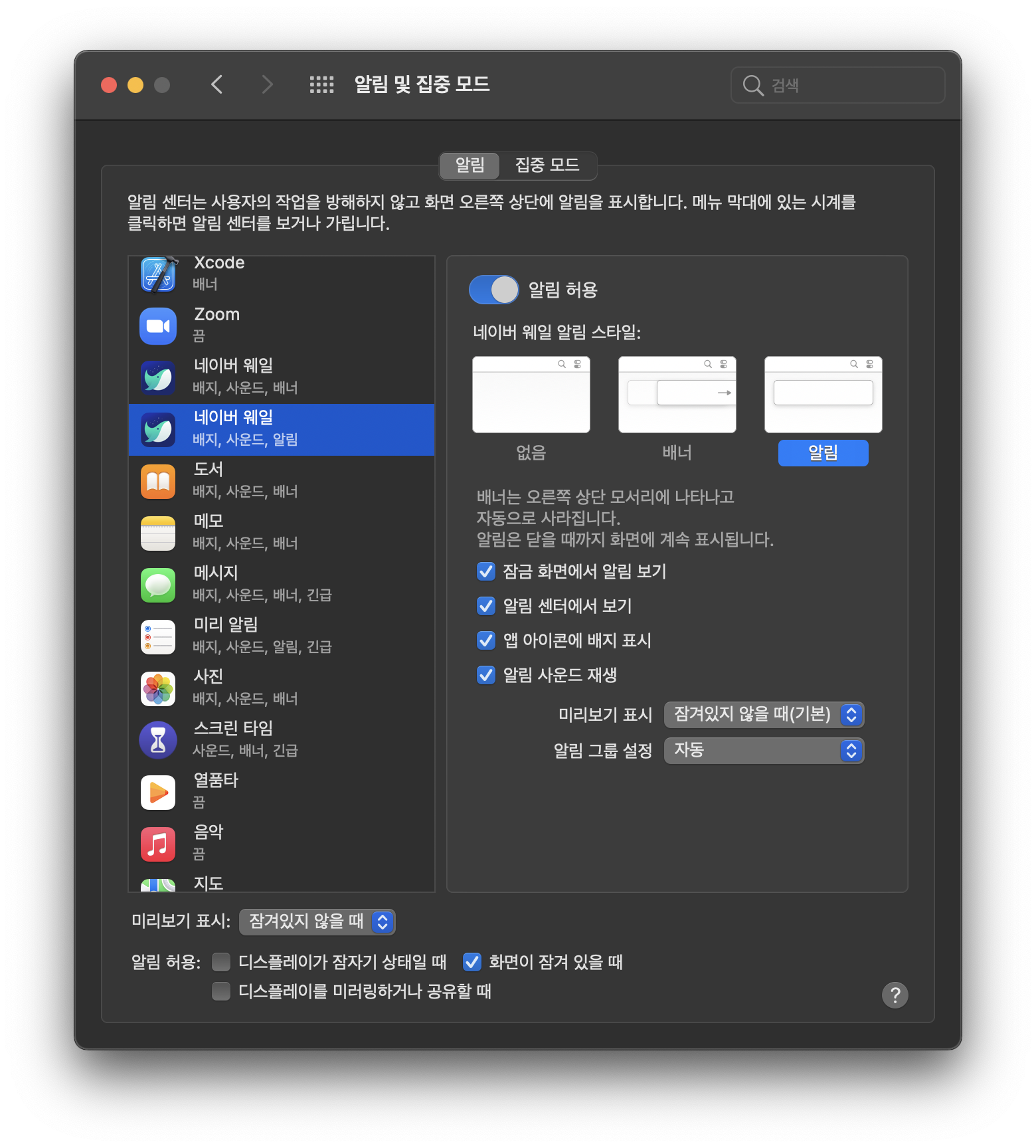 설정-알림 및 집중 모드-네이버 웨일-알림 허용을 해주시면 됩니다! (참고로 카톡도 이거 허용해주시면 윈도우처럼 메시지 알림이 떠요!)