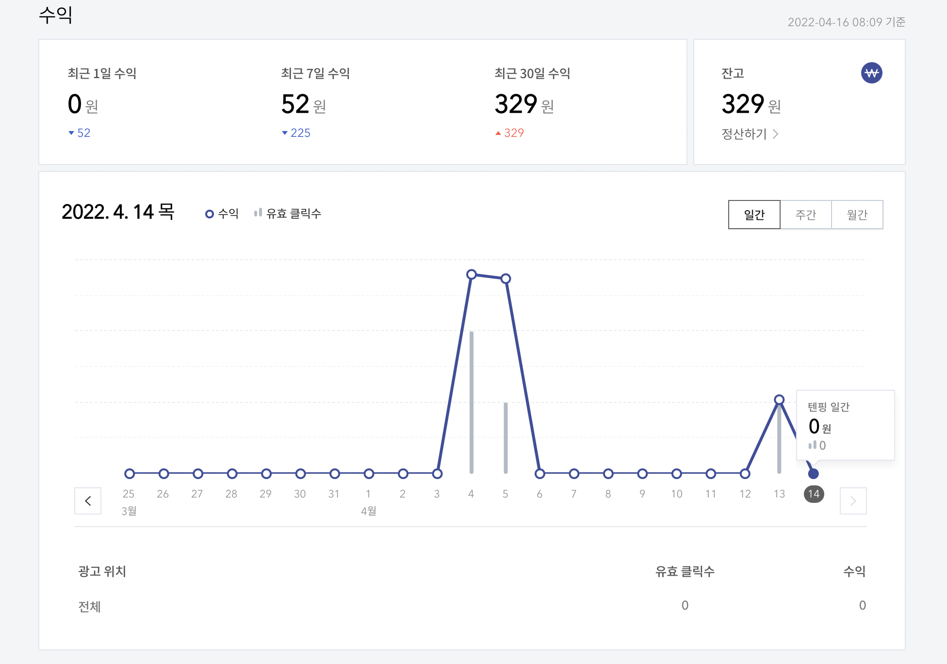 근데 아직까지는 클릭당 광고 수익이 애매한게 어떤건 한번 클릭에 50원 정도하고,